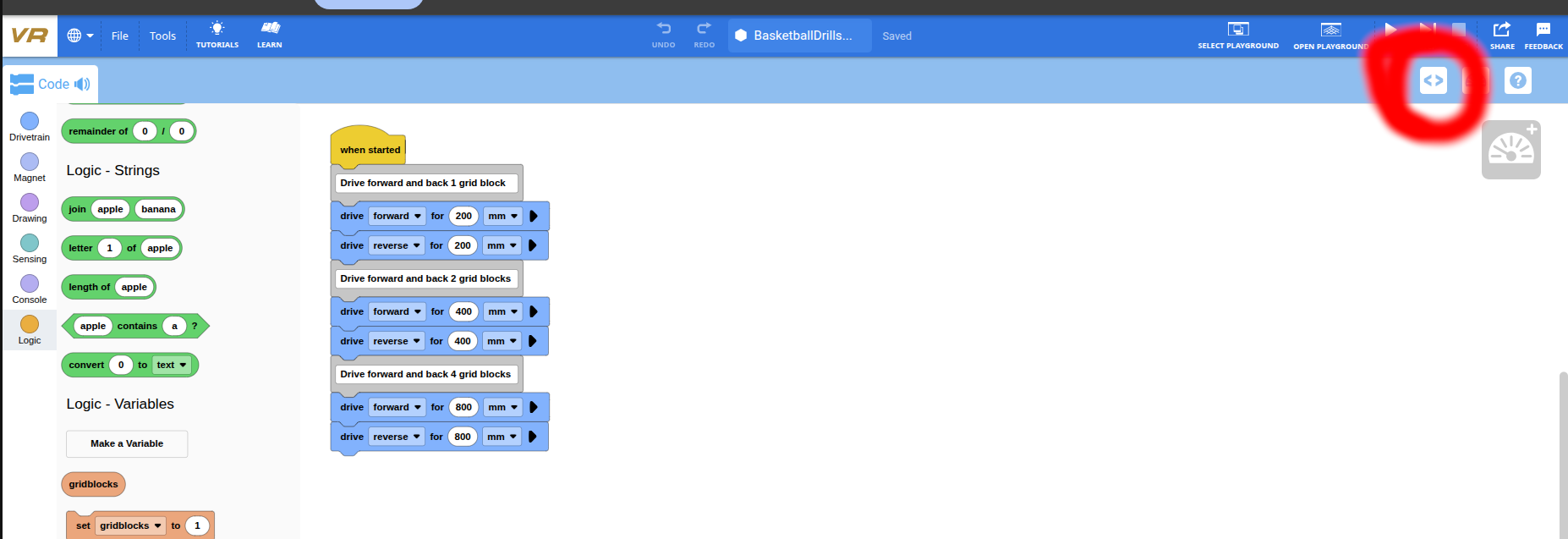 1. Click on the code button to view your python code: